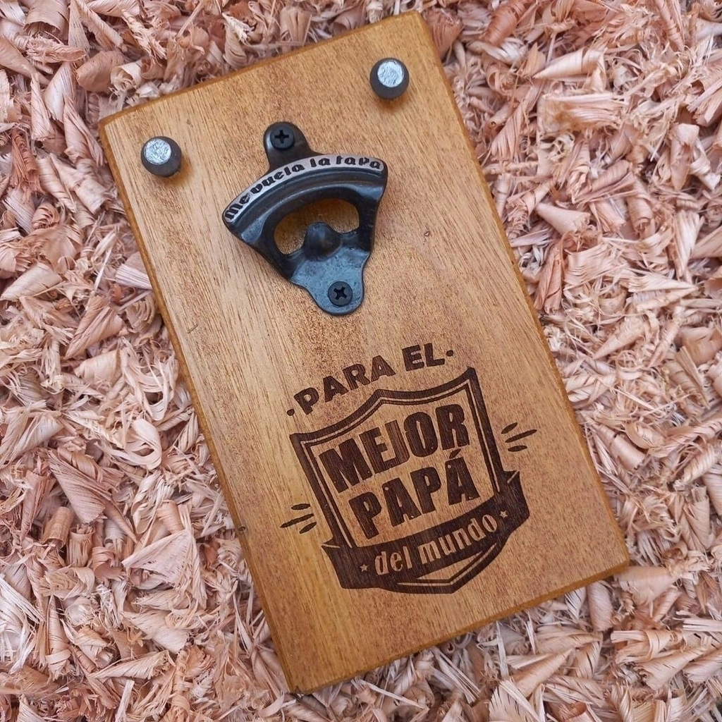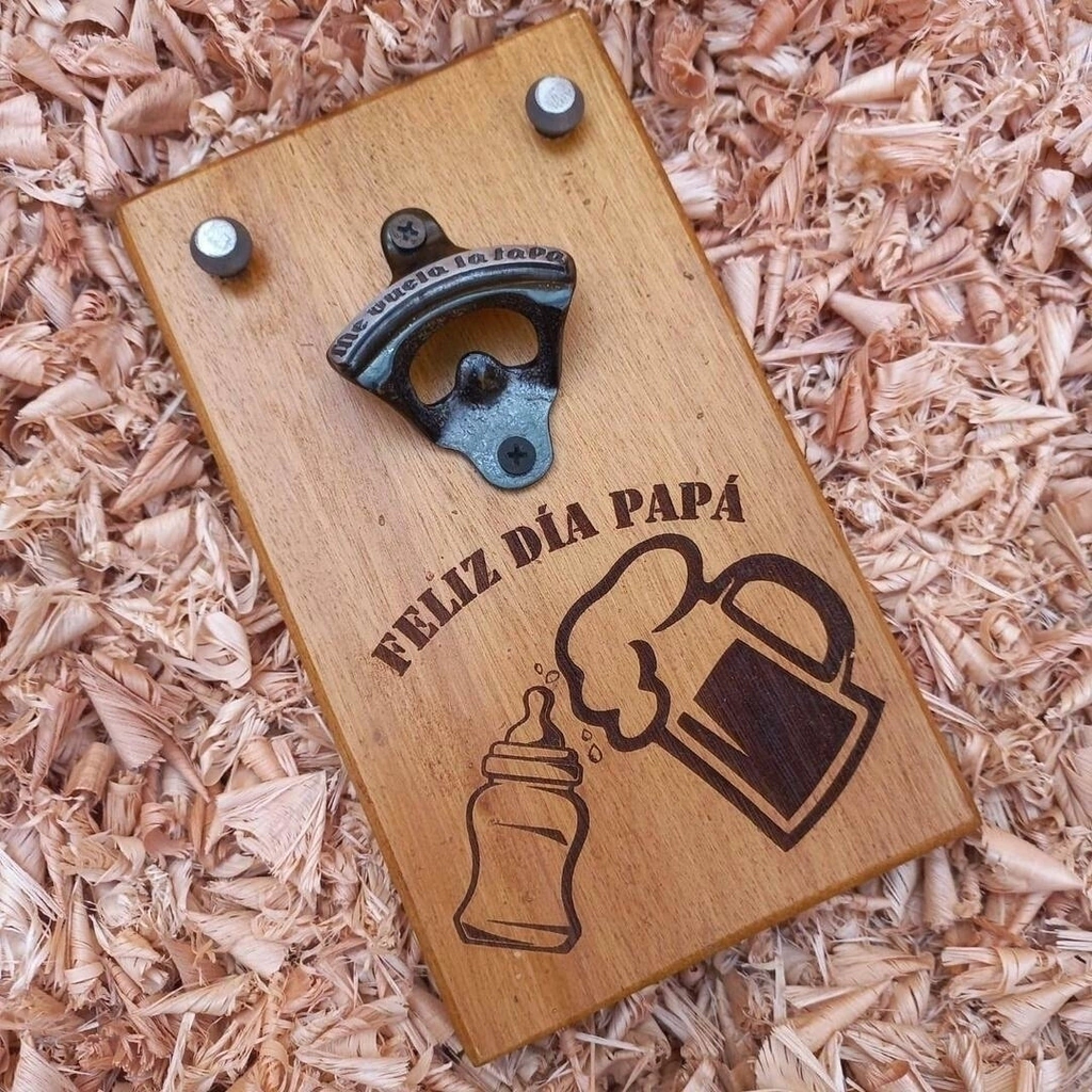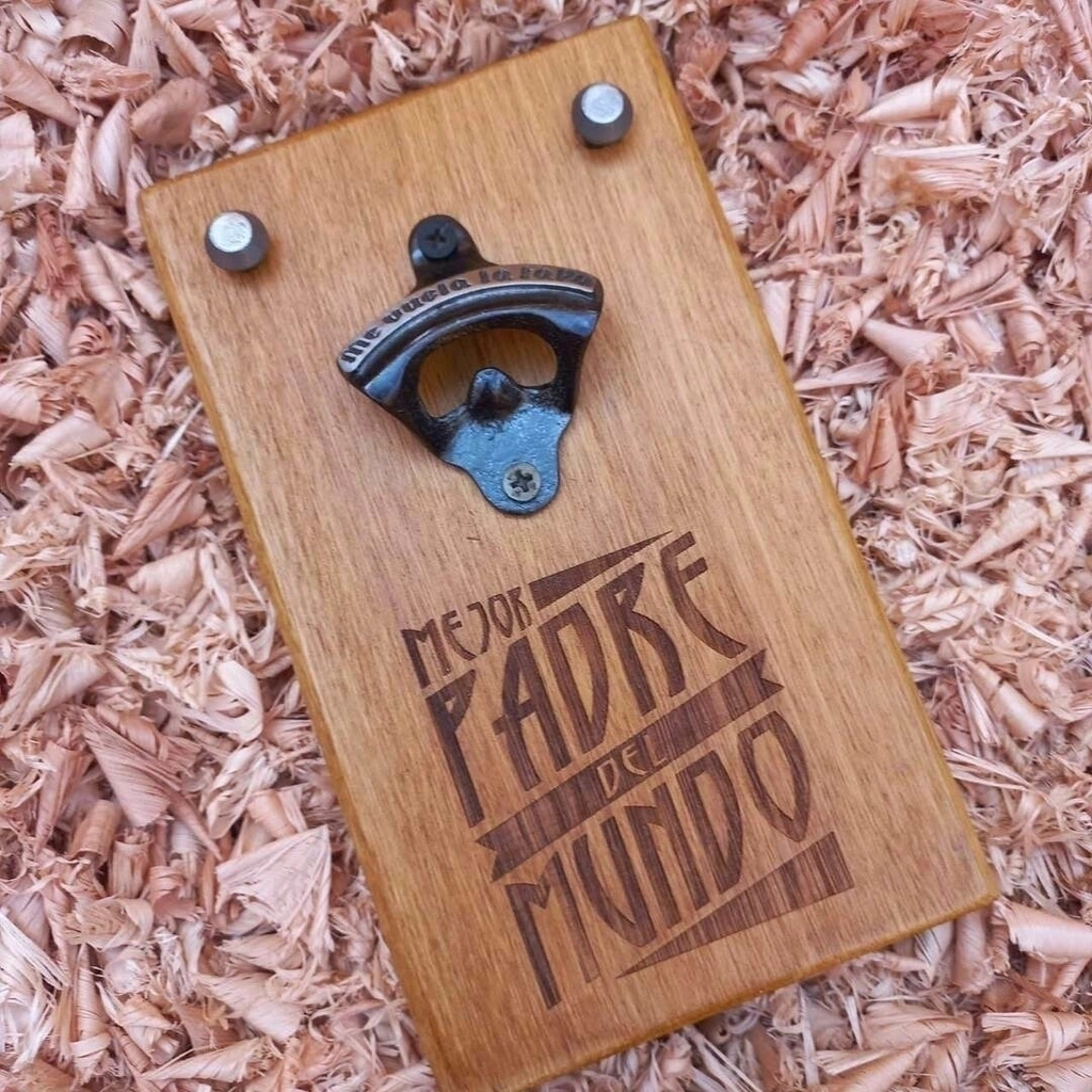 Destapador de cerveza de pared, realizado en madera de eucalipto con grabado láser.