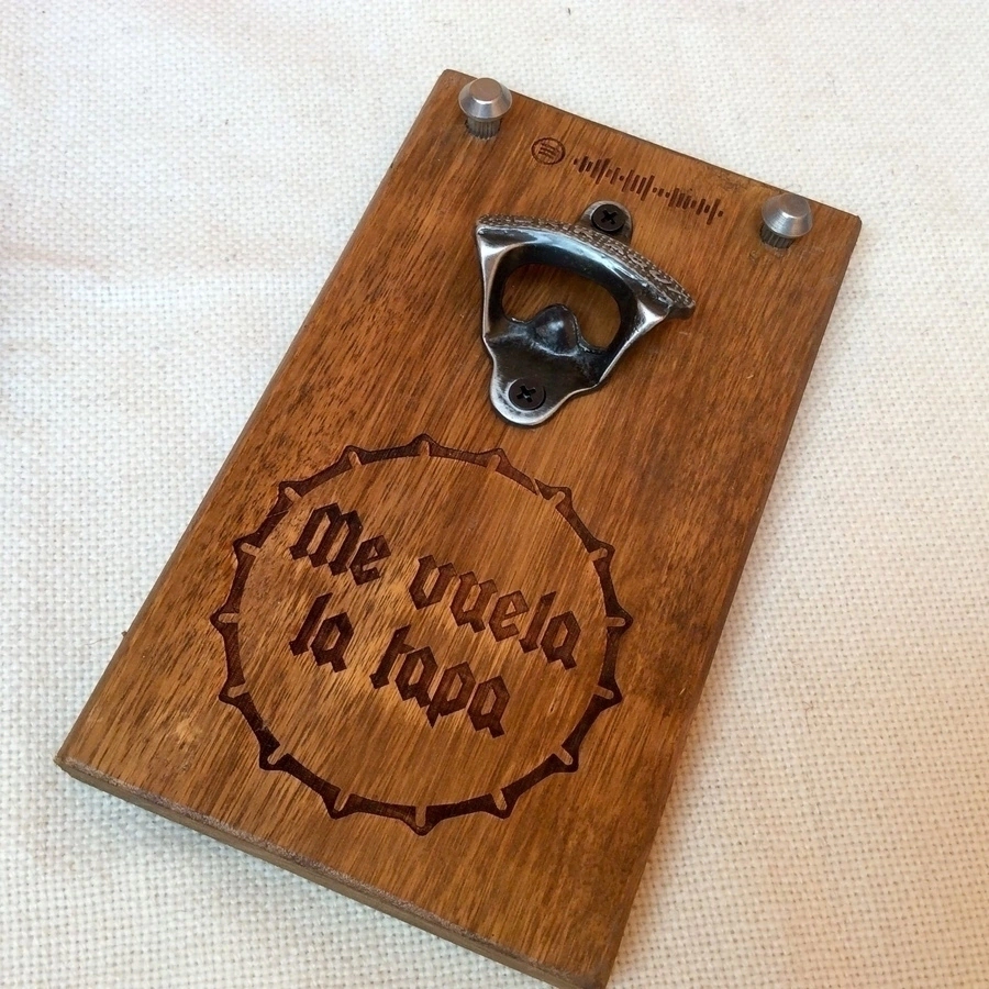 Destapador de cerveza de pared, realizado en madera de eucalipto.