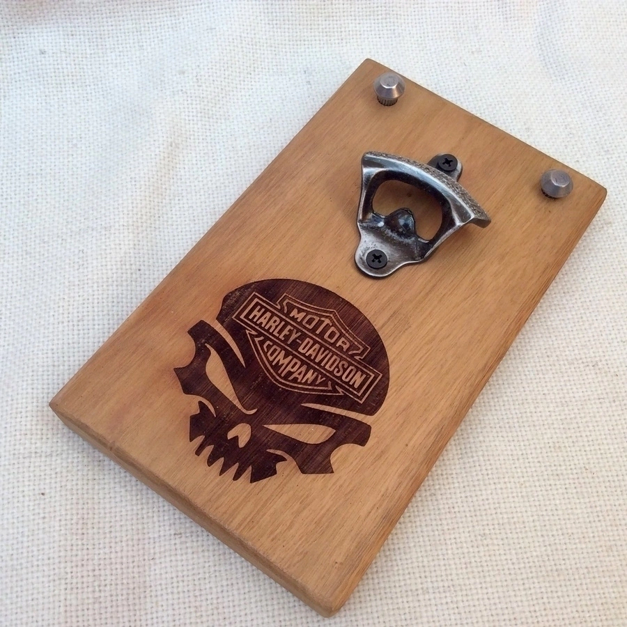 Destapador de cerveza de pared, realizado en madera de eucalipto.