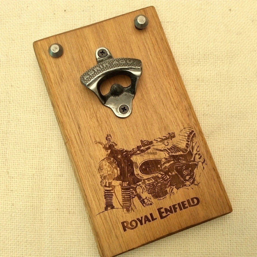 Destapador de cerveza de pared, realizado en madera de eucalipto.