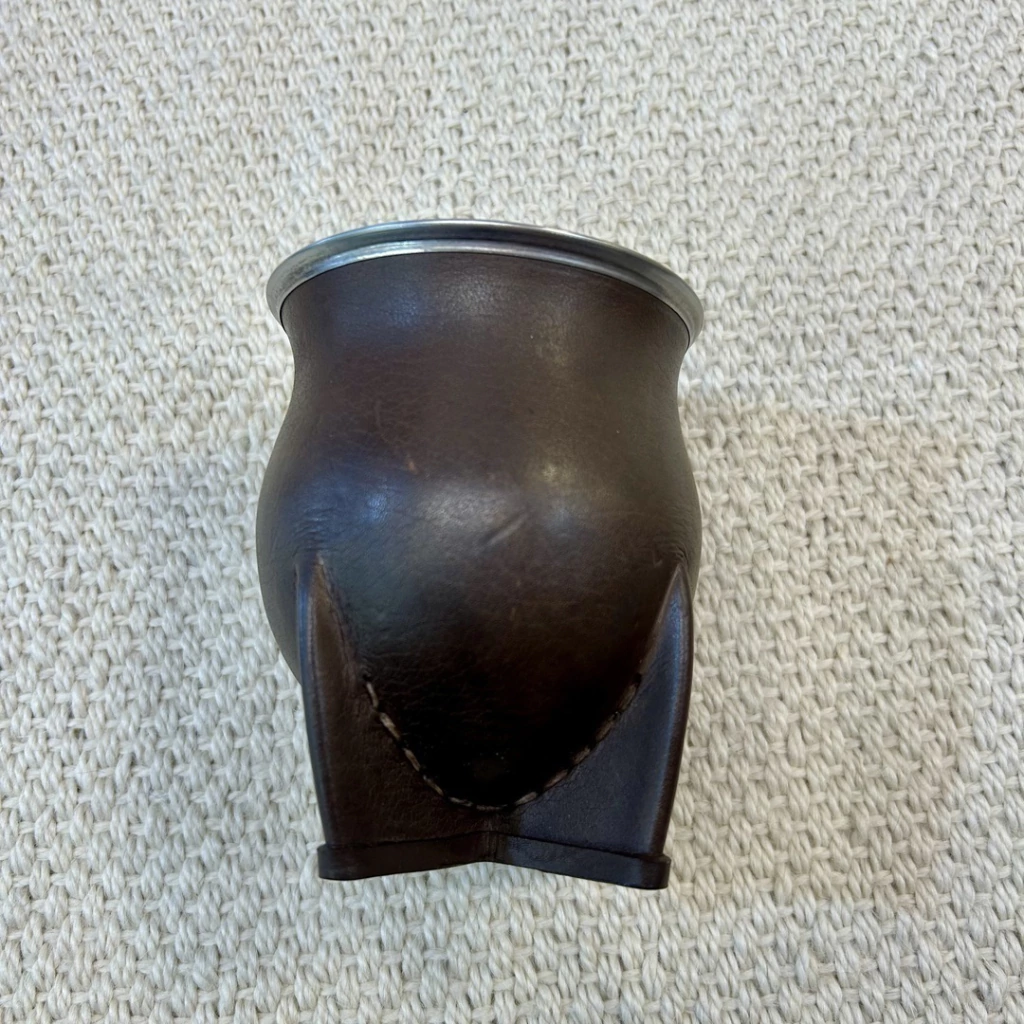 Mate de calabaza forrada en cuero con virola de acero y cuatro patas reforzadas.