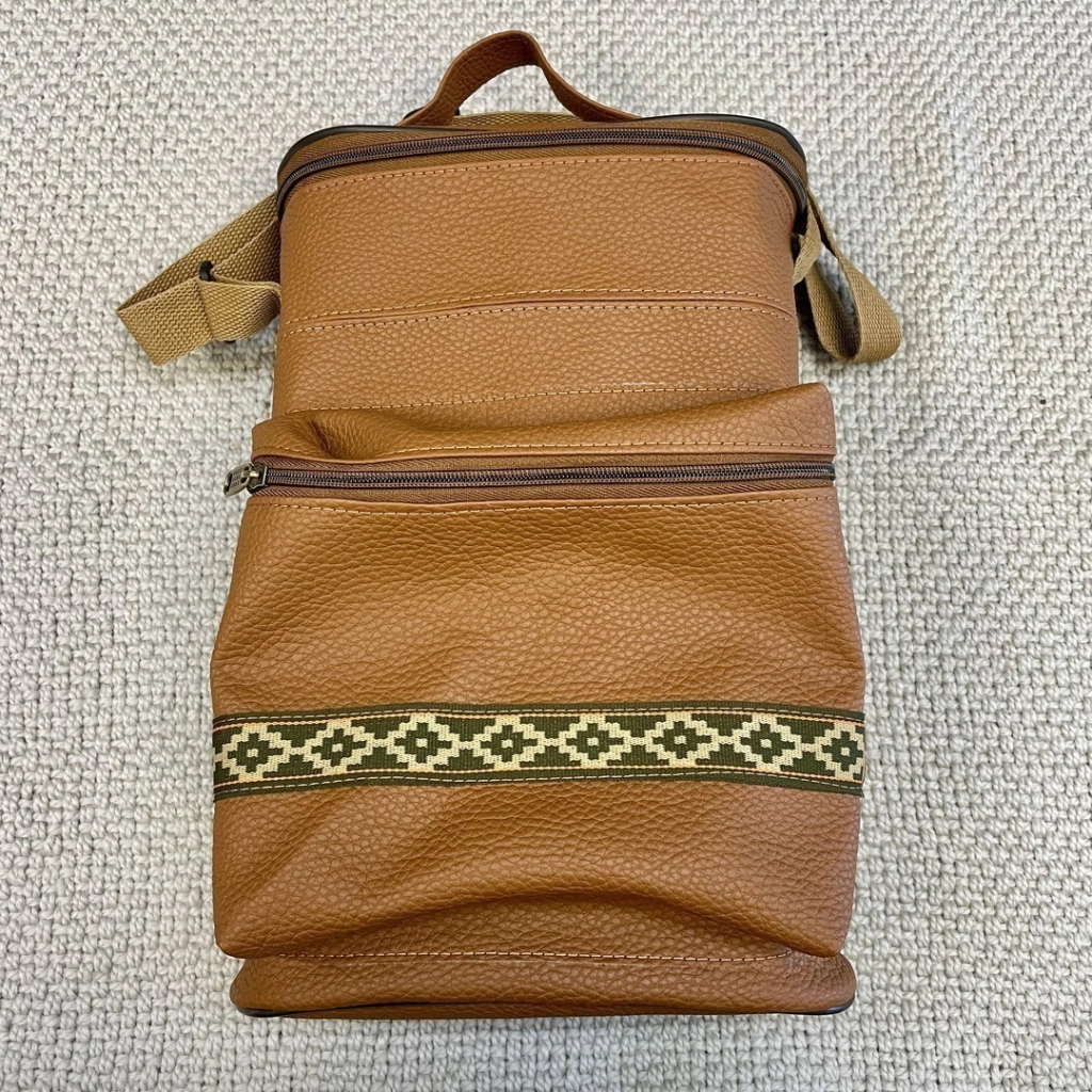 Portatermo confeccionado en simil cuero con cierre, bolsillo y correa.